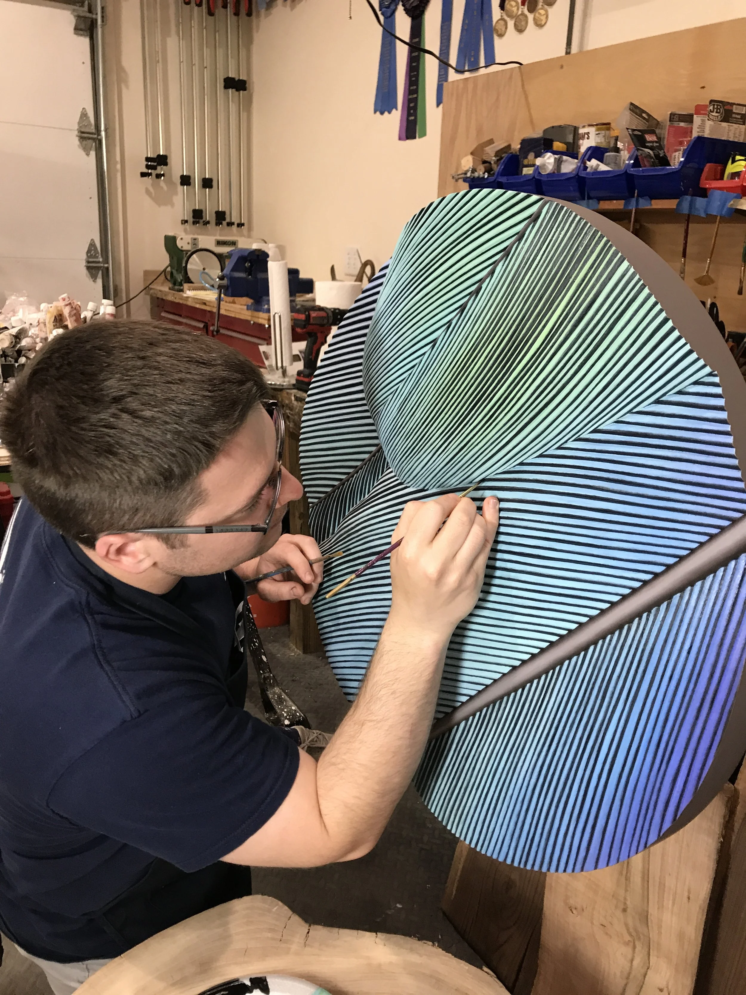Spencer Tinkham developed a fondness for the natural world, investigating the water’s edge throughout his childhood. Before passing away from cancer, his grandfather instilled a lifelong passion for carving at age eight. Nothing enthralled Spencer more than large flocks of hungry waterfowl wintering behind his home. His first carvings were from small wood scraps. Next, Spencer carved life-sized duck decoys to lure waterfowl closer and to critique his work next to wild birds. As a teenager, he twice won the Youth World Duck Decoy Carving Championship. His sculptures are no longer utilitarian, but Spencer still uses many reclaimed materials. Entirely self-taught, his recent body of work was inspired by a feather he closely examined on a daily walk during the COVID-19 pandemic. Colors, shapes, and textures in natural objects, which are not easily discernible to the human eye, inspired his “macroscultpures.” Spencer’s work is collected and exhibited internationally. He is a David Shepherd Wildlife Foundation Wildlife Artist of the Year 2023 finalist and has pieces in the Leigh Yawkey Woodson Art Museum and Dollar Tree, Inc. collections.